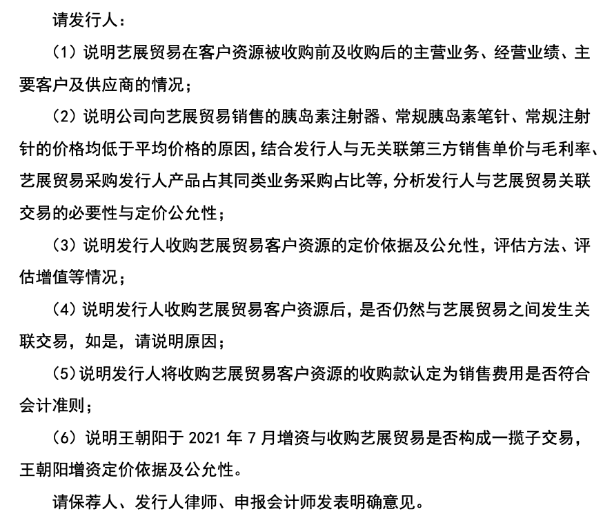 事实上,艺展贸易对公司的营收贡献不小。报告期内,公司向关联方艺展贸易销售的主要为胰岛素注射器、针管、常规胰岛素笔针及常规注射针产品,销售金额占同期营业收入的比例分别为16.74%、19.86%和8.24%,分别为当年公司第一大、第一大以及第二大客户。