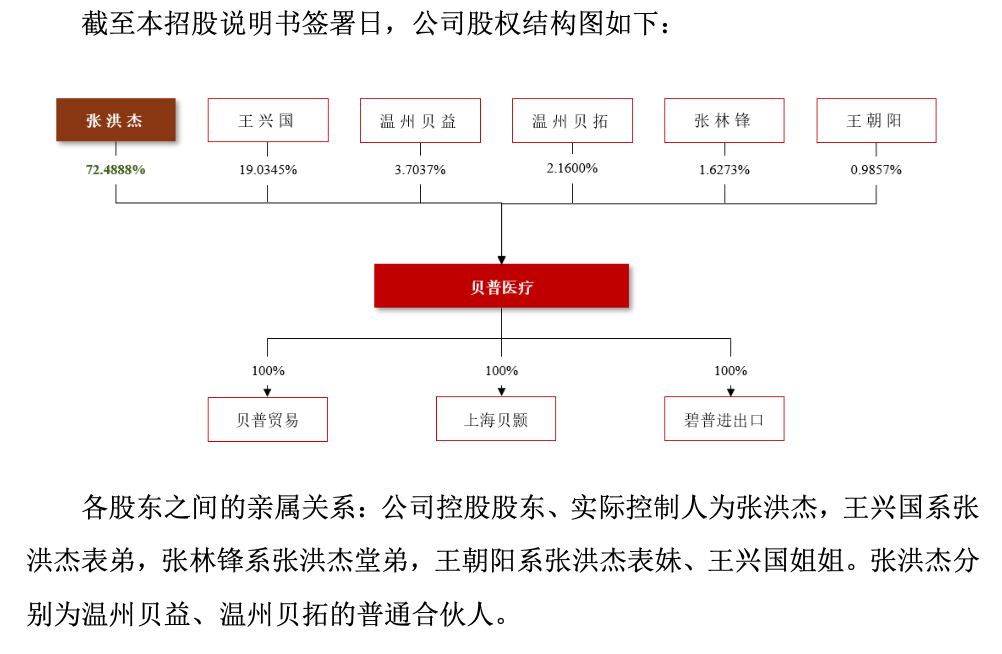 IPO前,张洪杰为贝普医疗的控股股东、实际控制人,其直接持有公司72.49%股份,通过担任温州贝益和温州贝拓的普通合伙人间接控制公司5.86%的股份,合计控制公司78.35%的表决权。