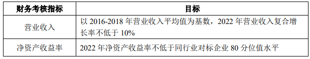本期员工持股计划设公司层面的业绩考核要求和持有人个人层面的绩效考核要求。公司层面业绩考核指标包含基本的财务指标和多维的综合指标:基本的财务指标以2016-2018年营业收入平均值为基数,2022年营业收入复合增长率均不低于10%,且净资产收益率不低于同行业对标企业80分位值水平。