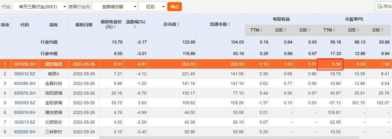值得一提的是,旗滨集团目前股价存在被低估的可能。申万玻璃制造行业下共有8只个股,市盈率(TTM)平均值为56.16,中值为17.33.旗滨集团市盈率为8.58,位列倒数第二。