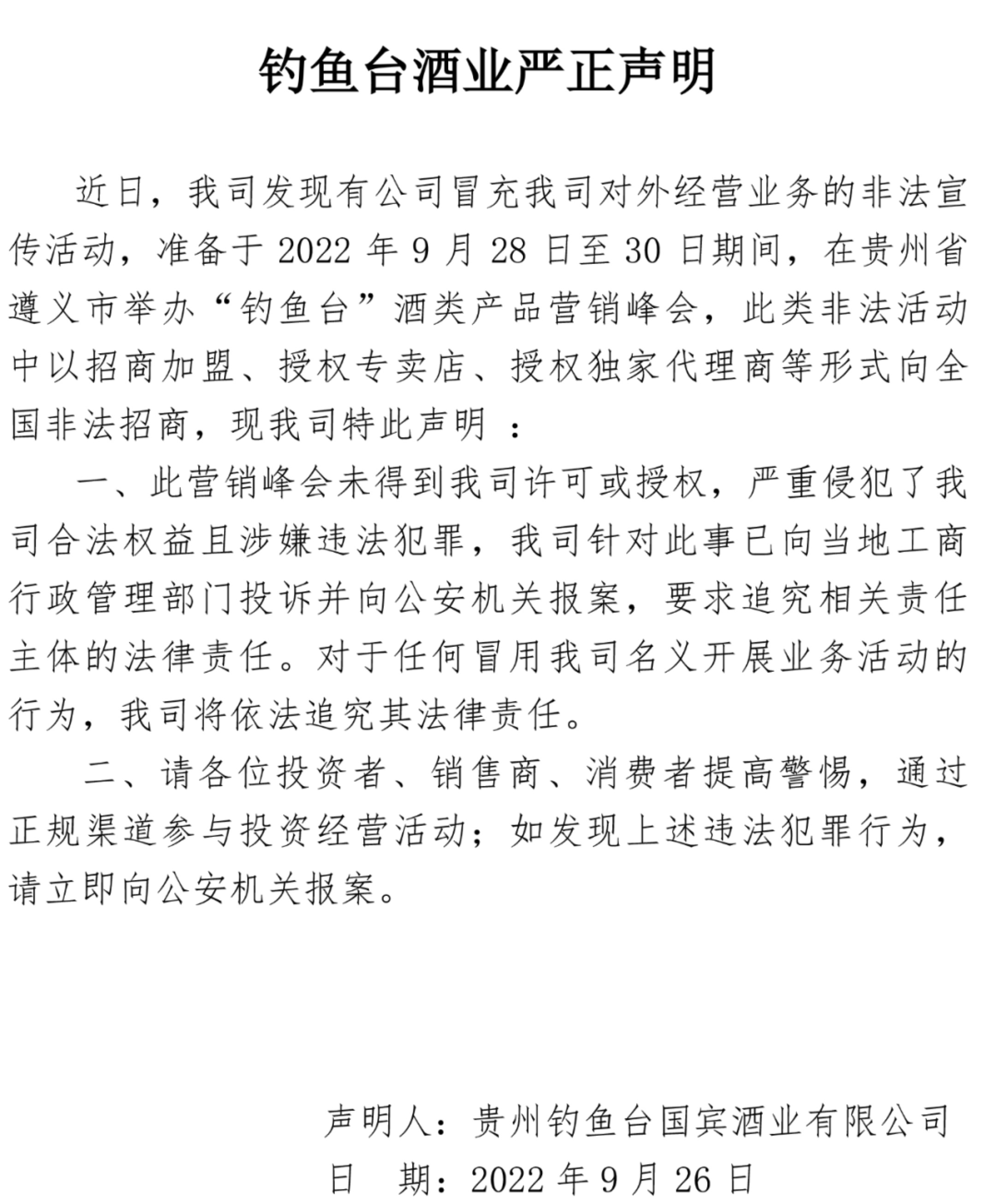“钓鱼台酒”微信公众号消息,9月26日,贵州钓鱼台国宾酒业有限公司发布声明:近日,我司发现有公司冒充我司对外经营业务的非法宣传活动,准备于2022年9月28日至30日期间,在贵州省遵义市举办“钓鱼台”酒类产品营销峰会。此营销峰会未得到我司许可或授权,严重侵犯了我司合法权益且涉嫌违法犯罪,我司针对此事已向当地工商行政管理部门投诉并向公安机关报案。