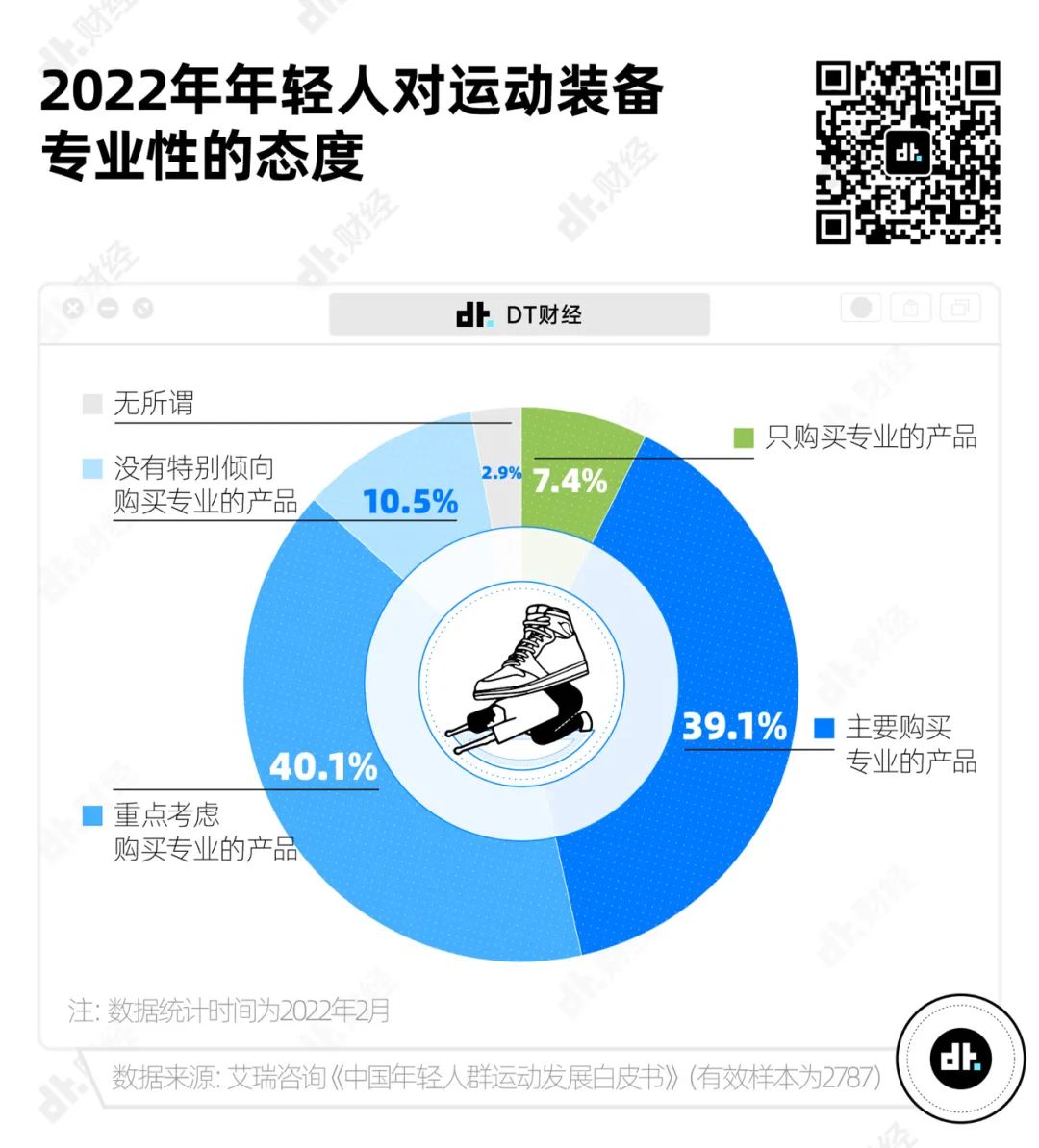 他们一方面要求专业,艾瑞咨询的调研数据表明,近9成的消费者在购买时会倾向选择专业的产品,7.4%的年轻人只购买专业的产品;另一方面,运动装备也要体现生活方式和时尚态度。