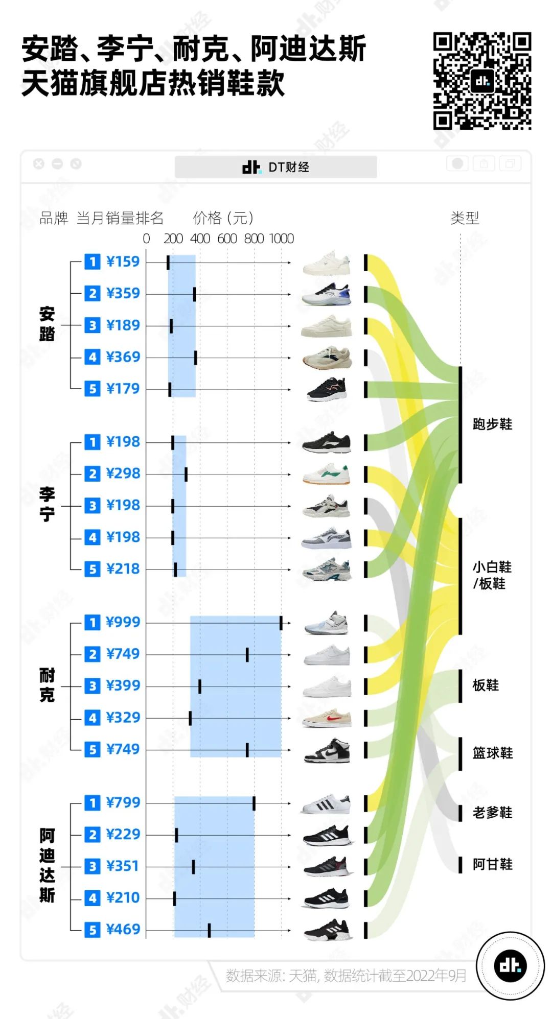 DT财经简单统计了几大运动品牌官方旗舰店的热门鞋款,可以看到,国产品牌的热销产品价格明显更加亲民,在类型上,国产品牌热销主要集中在跑鞋和板鞋,而耐克最热销的是篮球鞋。