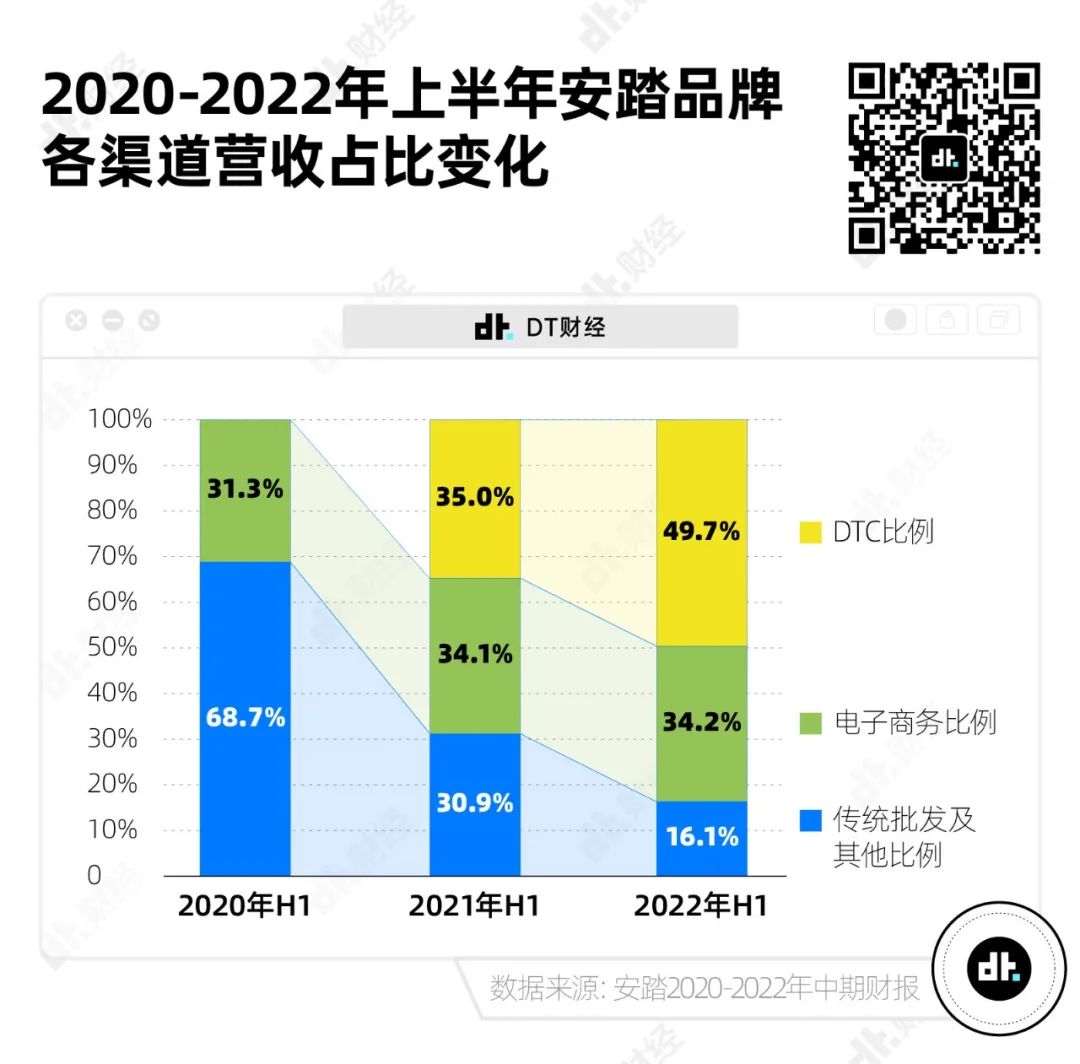 从财报数据和集团口径解释来看,安踏品牌的营收增长,主要是因为这两年进行的DTC销售模式变革取得成效。2022上半年,安踏品牌营收中DTC渠道的占比已经接近一半。