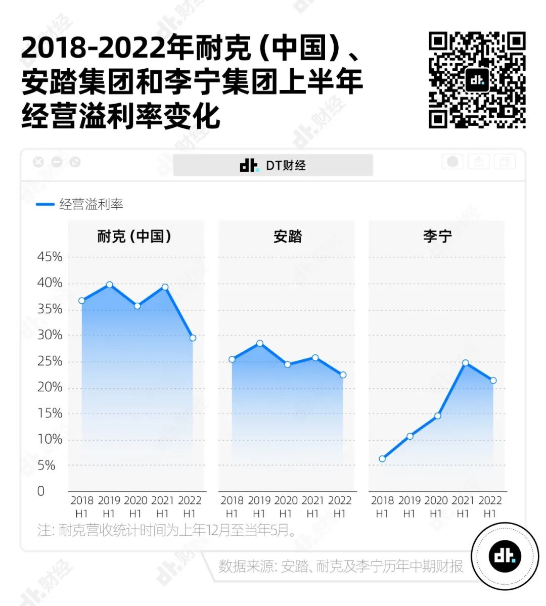 而这也是原本定位面向大众的国产品牌在努力提升的。对比耐克中国、安踏和李宁,2021年之前,耐克中国的经营溢利率一直保持在35%以上,2022上半年业绩受挫,但依然达到了29.4%,高于安踏的22.3%和李宁的21.3%。