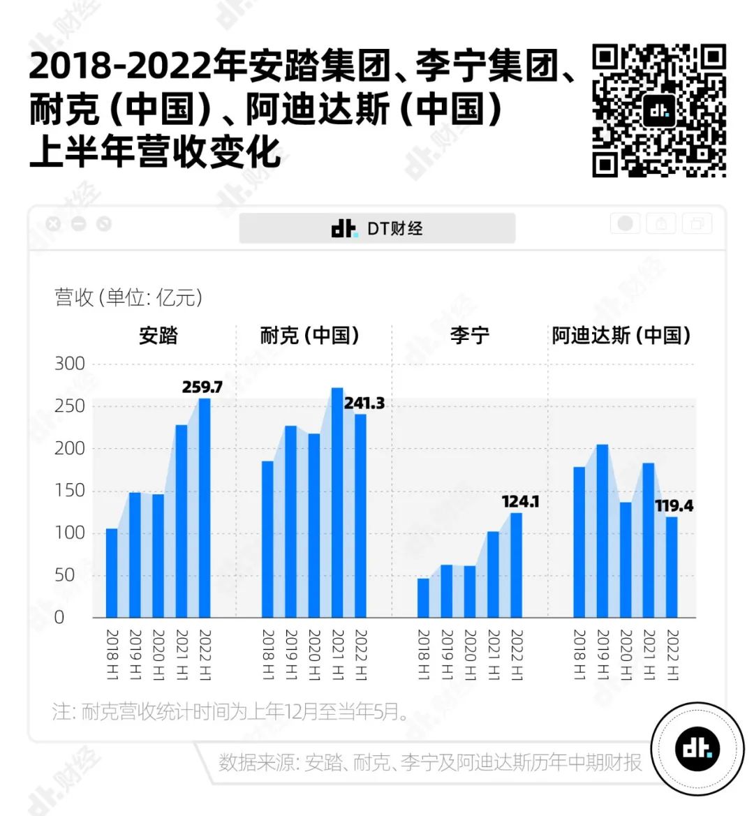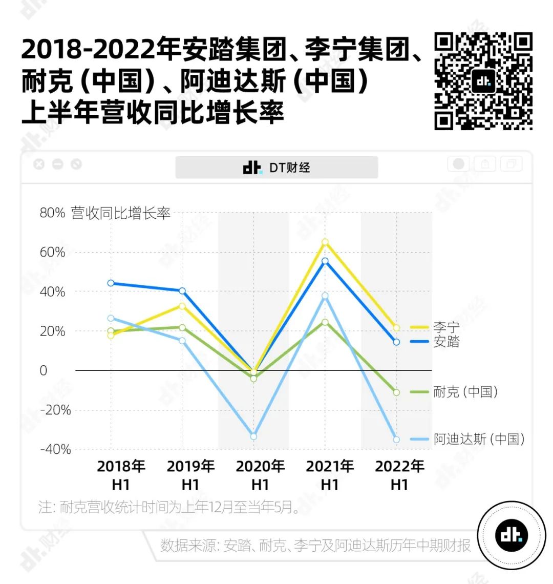 来到2022上半年,疫情反复,耐克中国营收同比下滑11%,阿迪达斯中国同比下滑35%,安踏(13.8%)和李宁(21.7%)虽然不如去年那么迅猛,但仍保持正向高速增长。