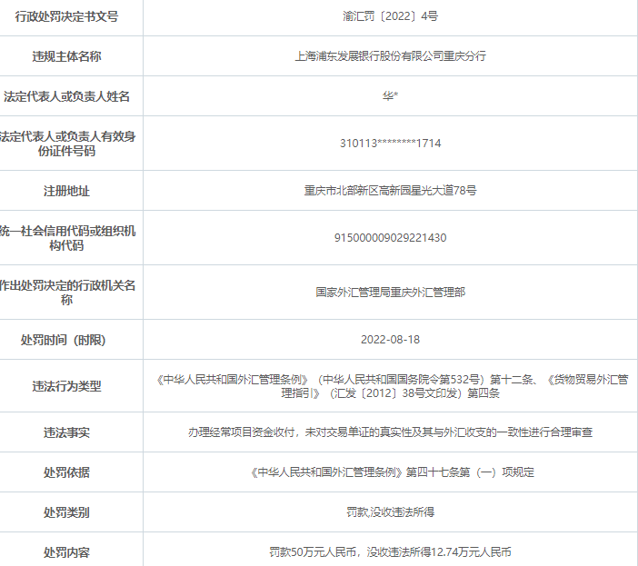 对此,国家外汇管理局重庆外汇管理部罚款对浦发银行重庆分行处以罚款50万元人民币,没收违法所得12.74万元人民币。