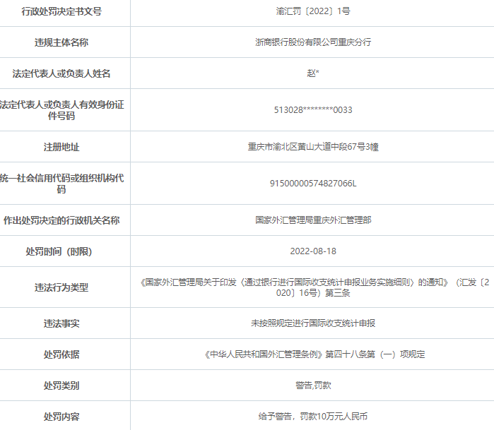另外就在同日,浙商银行重庆分行因未按照规定进行国际收支统计申报,违反《国家外汇管理局关于印发〈通过银行进行国际收支统计申报业务实施细则〉的通知》(汇发〔2020〕16号)第三条被国家外汇管理局重庆外汇管理部给予警告,并罚款10万元人民币。