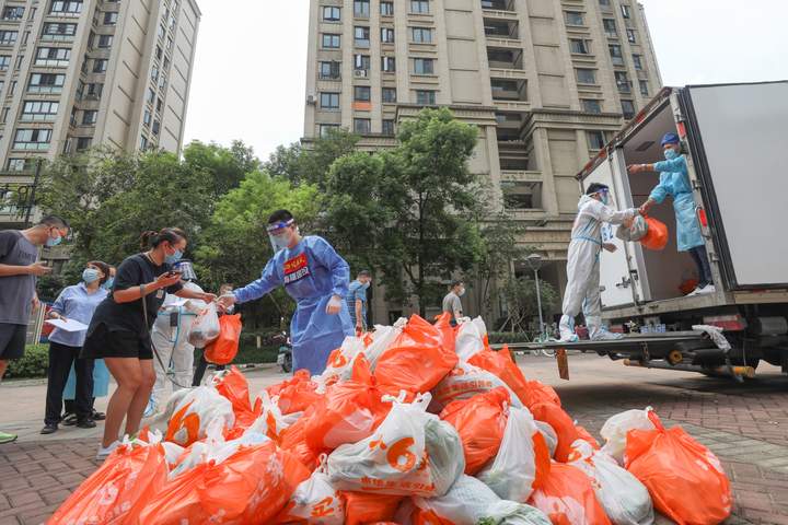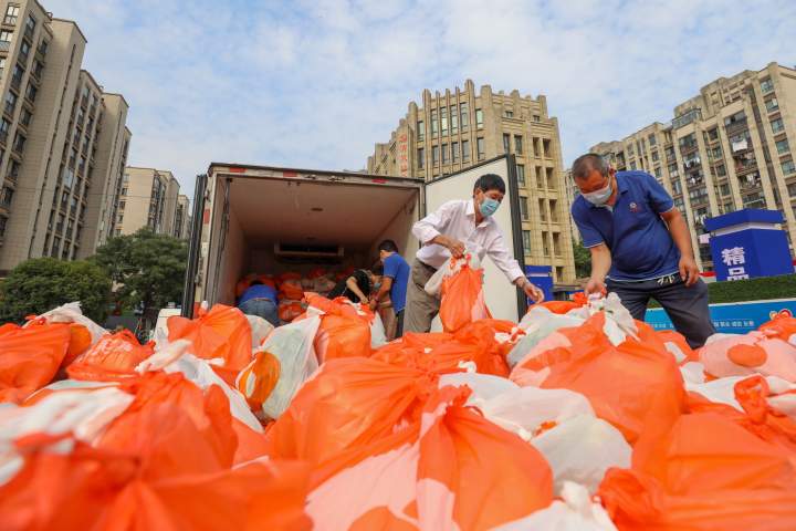 “菜到了!”9月27日清晨7时许,9辆满载4600份基本生活必需品的亮橘色货车分别开至青林湾西区的东、南、北几处入口。在东门入口处,早已等候在此的海曙国投集团“红海突击队”成员赵秉权等人和街道、社区工作人员远远望见后,当即一路小跑上前接应,搬运、清点、运送、派发等工作随即有序开展。