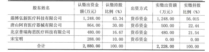 具体来看,唐山弘新医院成立于2016年10月,由新华医疗全资子公司淄博弘新医疗科技有限公司(下称“淄博弘新”)、唐山阿育医疗器械有限公司、北京普瑞海思医疗科技有限公司、自然人宋宝明发起设立,注册资本为2880万元。其中,淄博弘新持股1248万元,持股比例43.34%。