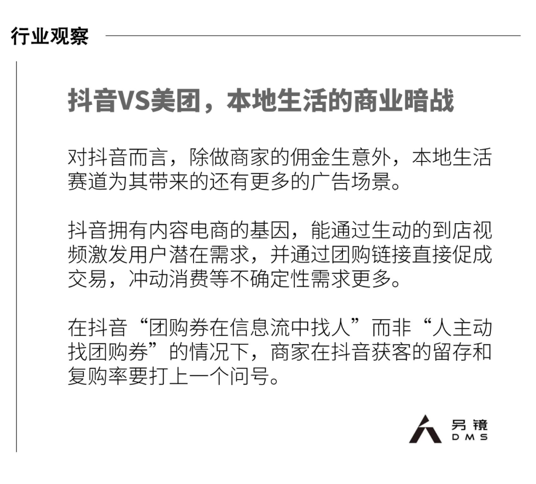 商家与抖音的合作也是看中了抖音的流量,商家也希望平台能帮助自己触及更多客户,将平台的公域流量导向私域,但在抖音“团购券在信息流中找人”而非“人主动找团购券”的情况下,商家在抖音获客的留存和复购率要打上一个问号。