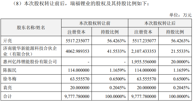 亿纬锂能拟以自有资金受让山东瑞福锂业有限公司(下称瑞福锂业)20%股权,转让价款为8.00亿元。转让完成后,亿纬锂能将成为瑞福锂业第三大股东。