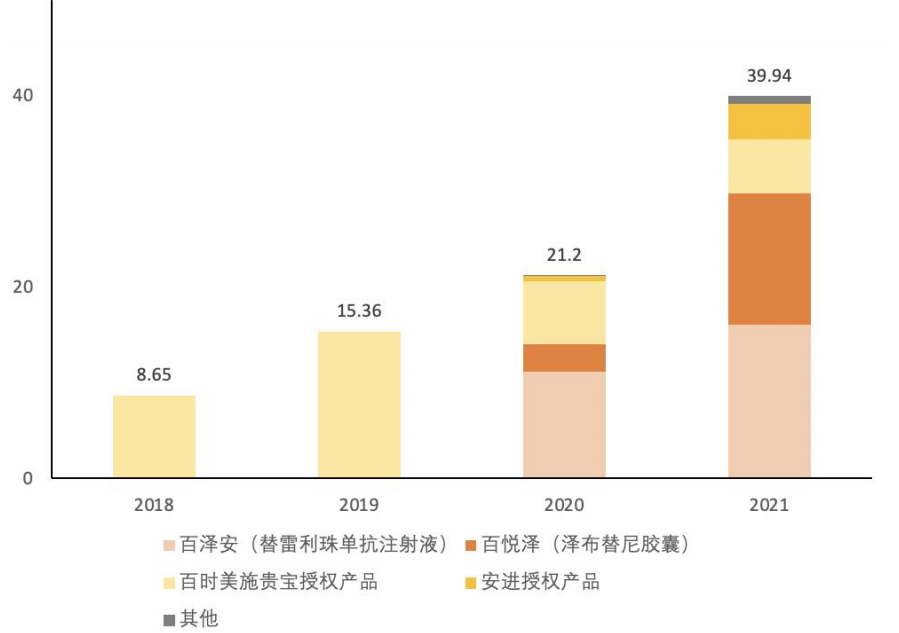 图:百济神州药品销售收入构成(亿元),来源:天风证券