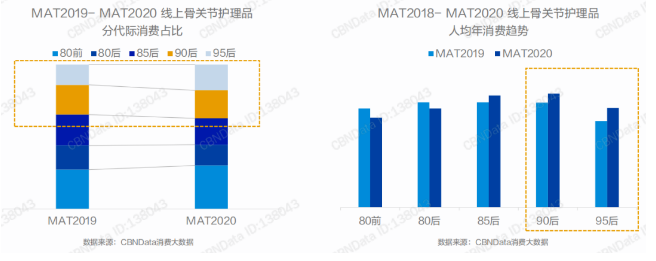 在“人人护关节”的大潮中,年轻人看似不相关,但其实20来岁就得痛风、关节炎的年轻人不少见。数据显示,年轻人群在线上骨关节护理市场拥有着更强的购买力。数据显示,90后、95后已经纷纷加入关节护理大军,线上消费占比占整体人群四成,其中90后人群最舍得花钱,在各个代际人群消费最高;95后为骨骼关节健康投资的意识上升最快,消费升级速度较其他年龄层人群更快。整体市场尚未饱和,存在巨大潜力。