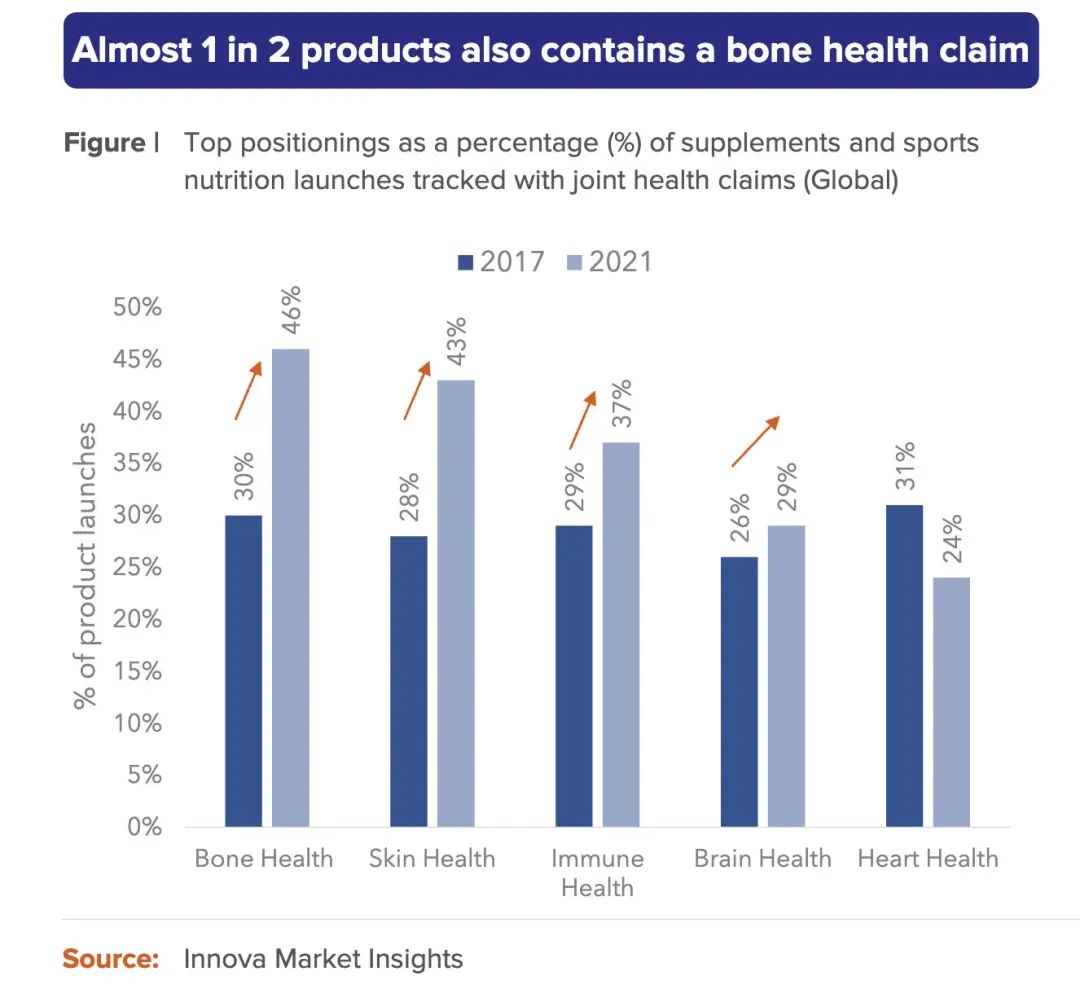 数据也表明多场景、多功能综合性概念在骨关节领域的发展潜力。据Innova Market Insights调查显示,从全球范围来看,关节健康类产品通常与声称具备骨骼、皮肤等营养养护价值协同出现。从2017到2021年间,关节健康与皮肤健康、免疫健康和脑健康领域的结合上均呈现出明显的上涨趋势。