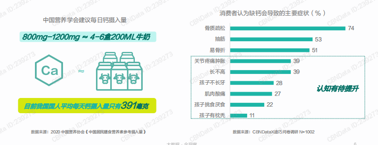 然而,从《2020大众补钙观洞察报道》的调查结果中可以看出,对于一些较为明显的骨关节营养缺乏症状如骨质疏松、易骨折等,消费者的认知普遍较强,但对于儿童骨关节疼痛、长不高等症状,消费者的认知仅有39%,儿童补钙意识仍待提高。