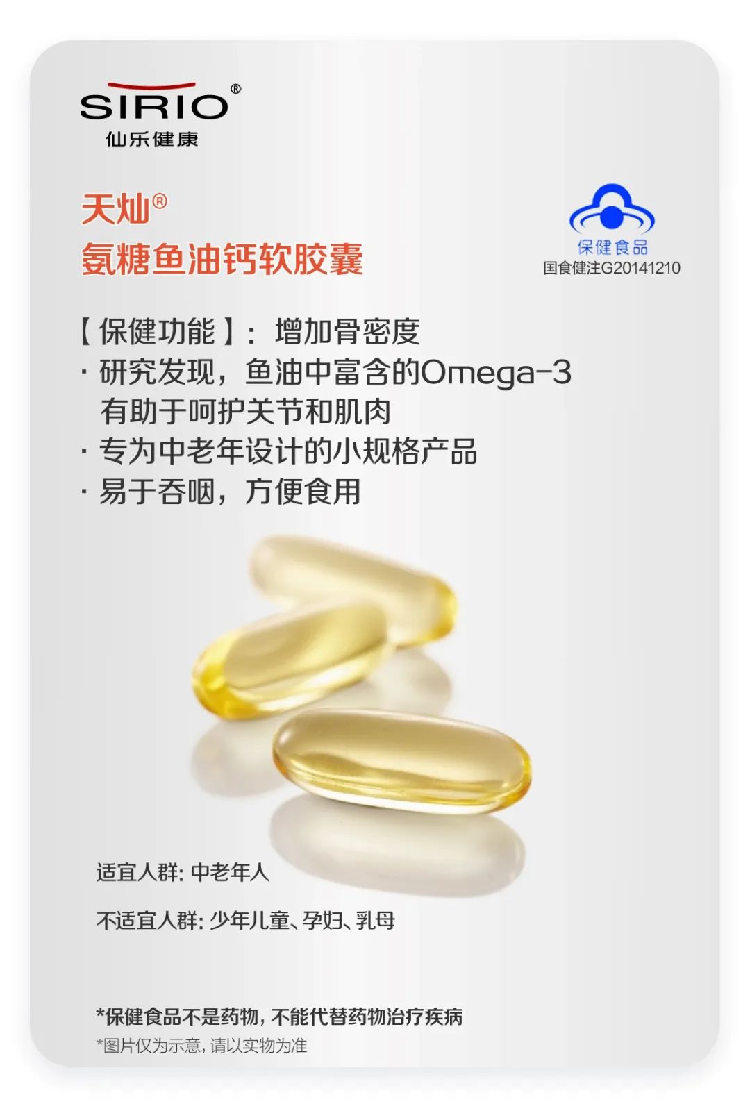 仙乐健康推出的天灿 氨糖鱼油钙软胶囊,就创新性地将氨糖与鱼油相结合,在利用氨糖促进软骨基质合成的同时,通过添加含有丰富的n-3高不饱和脂肪酸—EPA和DHA鱼油原料,帮助改善骨骼代谢功能,增加骨生成速率,增加骨密度。双原料的协同抗炎,也为老人提供了更便捷、复合的骨关节健康方案选择。此外,考虑到老年人特殊的需求,天灿 氨糖鱼油钙软胶囊更易吞服的规格设计,更是从细节处体现了产品的针对性,全面满足消费者的需求。