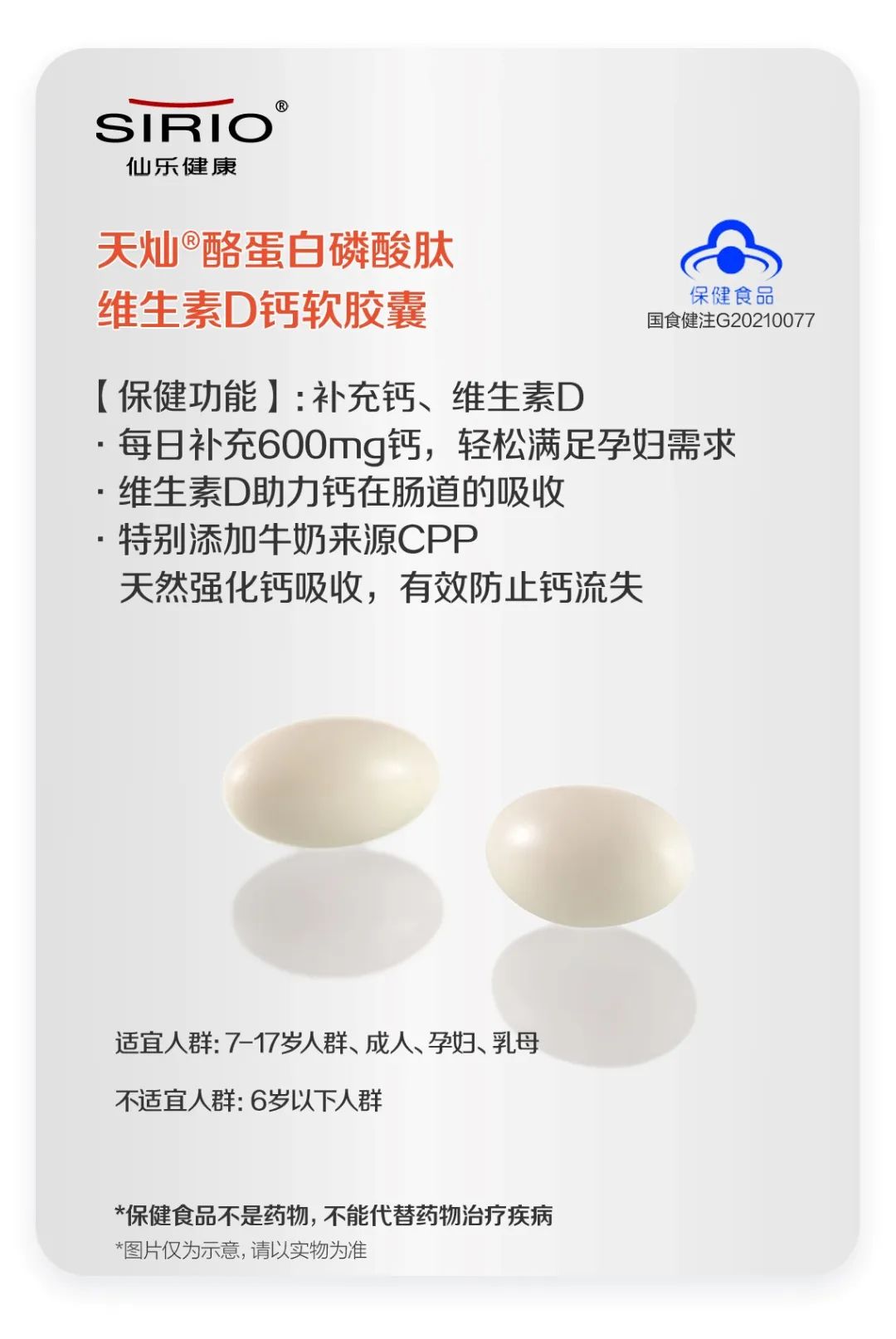 针对这一时期女性骨骼关节具有脆弱性,身体素质较低的特点。仙乐健康的天灿 酪蛋白磷酸肽维生素D钙软胶囊富含钙营养素,增加600毫克的日钙补充量,在考虑到妈妈们高钙需求的同时也符合适宜补充含量,避免摄入过多或不足,科学陪伴准妈妈和新手妈妈渡过这一人生阶段。