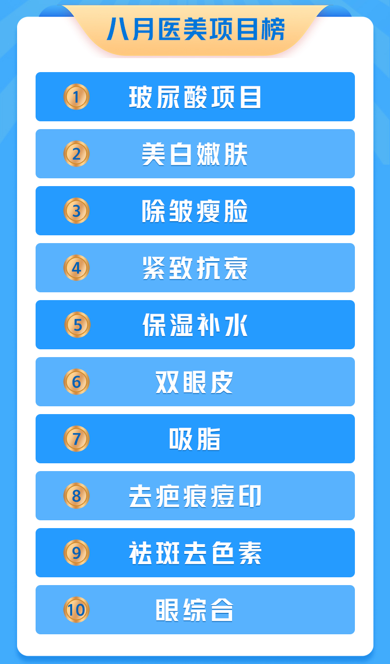 8月中国医美项目美商指数榜显示,玻尿酸项目、美白嫩肤、除皱瘦脸依然是求美者喜爱指数的TOP3。