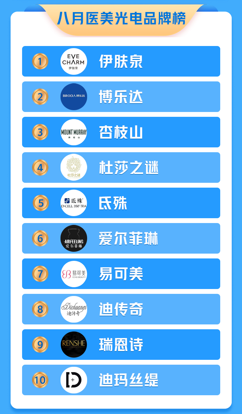 光电品牌美商指数榜如玻尿酸美商指数榜的榜单格局大体相同,伊肤泉、博乐达、杏枝山依旧是榜单前三,与七月榜单名次相同,其上榜品牌大致都是“老熟人”,可见榜单格局呈现维稳格局。