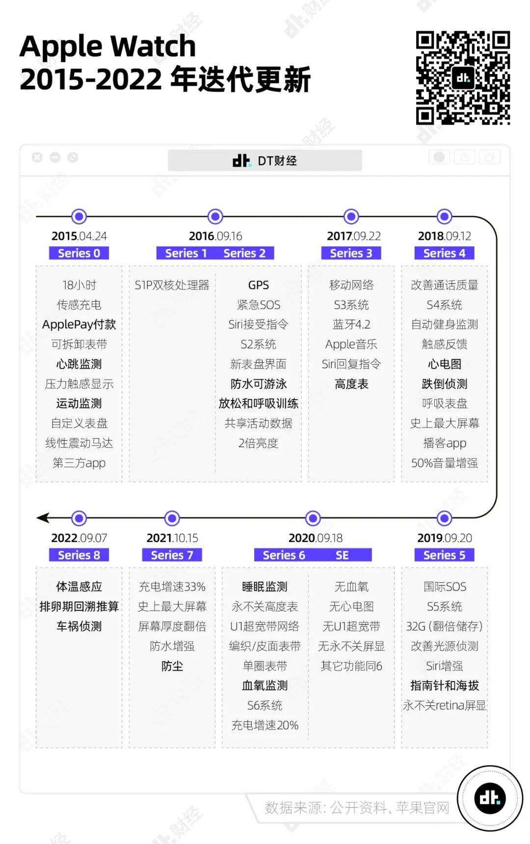 目前销量最高的五个智能手表品牌,都下属有不同的产品线,针对不同人群的需求。以苹果为例,今年九月发布的新款Apple Watch,就有SE(性价比款)、S8(全能标配)、Ultra(户外专业)三个系列。