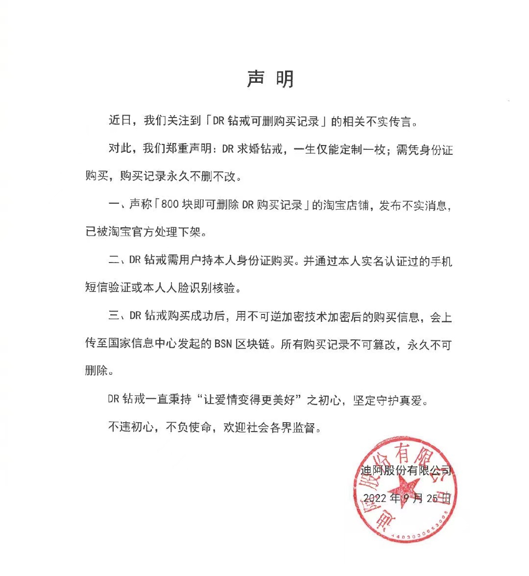然而,紧随其后的消息更是打破DR钻戒品牌形象,有传言称“800元可以删除购买记录”。对此,9月25日,DR钻戒官微就“800元可删购买记录”一事发布声明,称DR钻戒可删购买记录的相关传言不实。