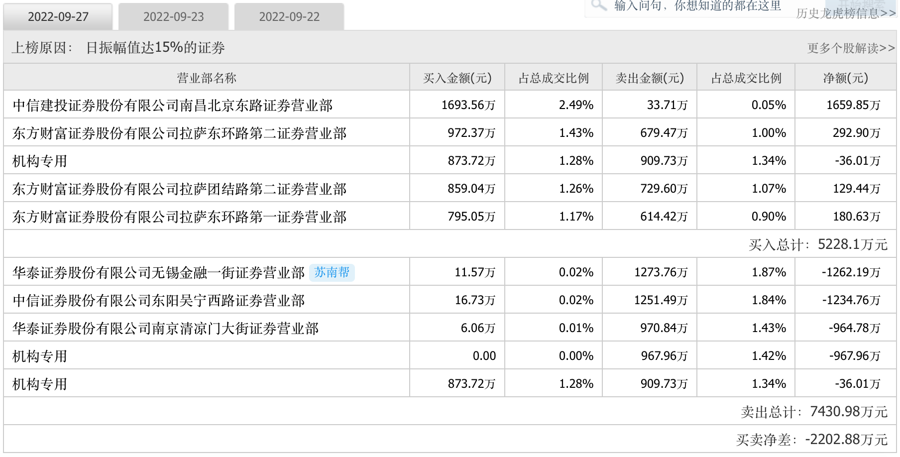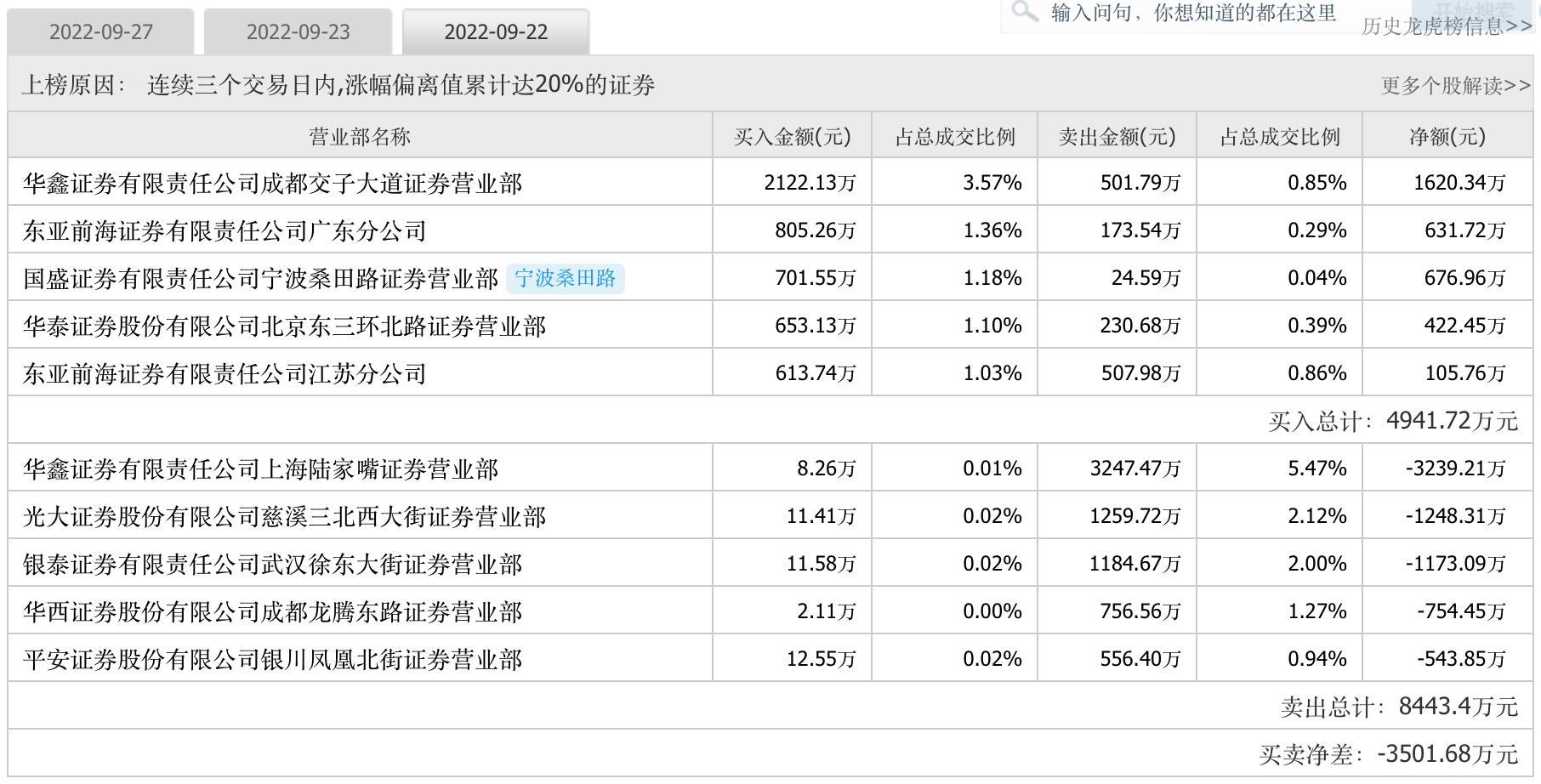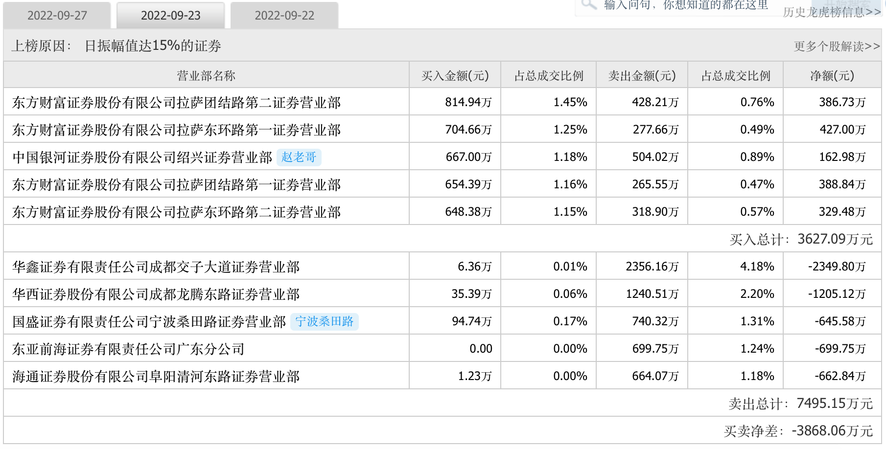 回看这几天的龙虎榜,各路大军齐聚。9月22日披露的龙虎榜有国盛证券宁波桑田路营业部;9月23日买入前五中出现了银河证券绍兴营业部,以及4家东方财富证券位于拉萨的营业部,包括拉萨团结路第二营业部、东环路第一营业部、团结路第一营业部、东环路第二营业部;9月27日的买入前五中,还出现了“机构专用”。