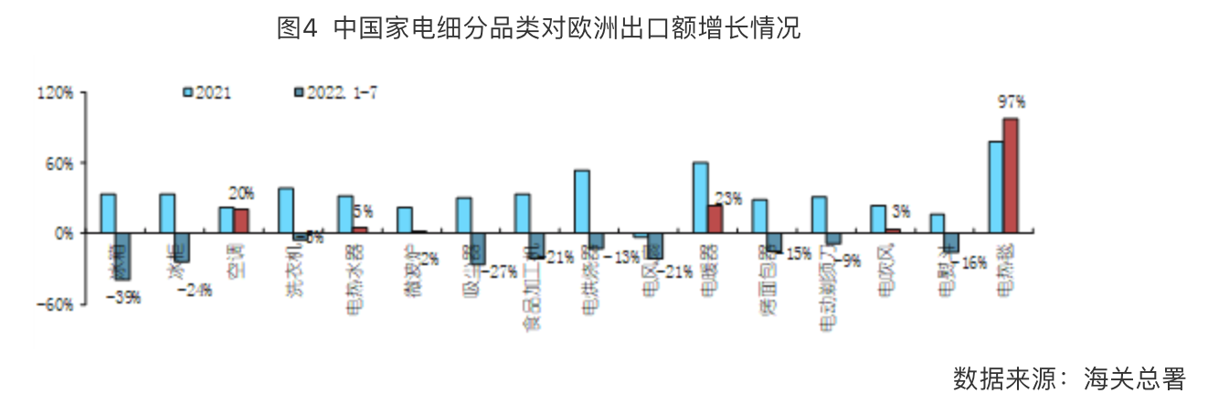 当下,2022年即将进入冬季,然因为众所周知的原因,欧洲方面的取暖问题严峻。在天然气大涨的背景下,取暖产品大受欢迎。根据中国家用电器协会的数据,2022年以来多数家电产品对欧洲出口额呈下降态势,增长的品类主要包括空调、电热水器、电暖器、电热毯、电吹风,1-7月累计出口额规模分别为19.9亿美元、1.3亿美元、4.9亿美元、3340万美元、1.6亿美元,其中电热毯以97%的增速引领其他品类。另外,空气源热泵增势也非常亮眼,整体延续了2021年的高增态势。从这些高增长的品类特点看,都具有温度调节的作用,说明欧洲消费者明显在扩大采暖类产品的采购,为即将到来的冬季做储备。
