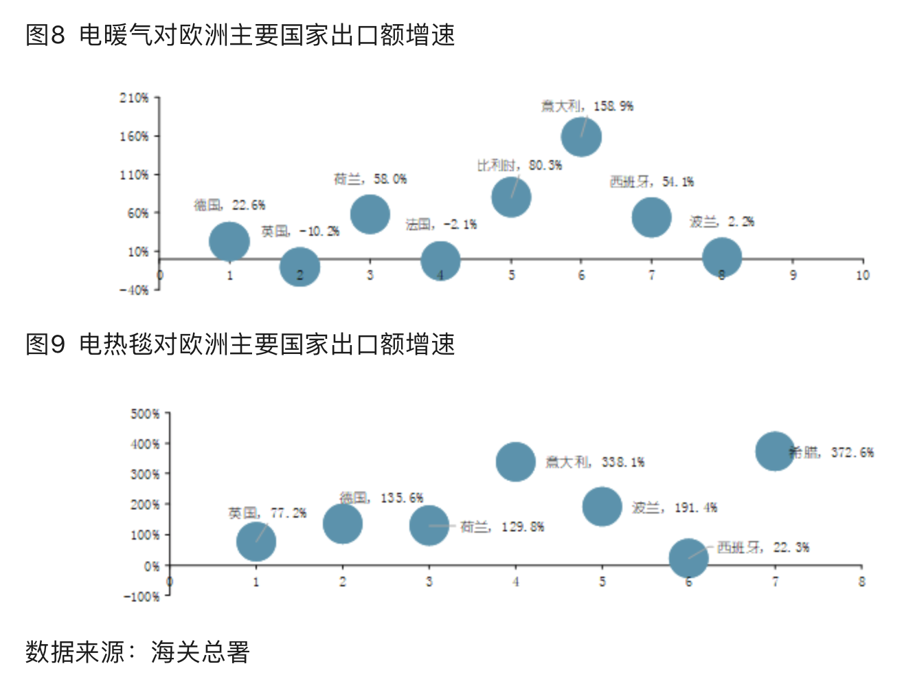 从电暖气、电热毯和空气源热泵三大主要增长品类看,电暖气方面,意大利、比利时、荷兰、西班牙、德国进口需求旺盛,英国、法国和波兰相对低迷。电热毯方面,各个国家进口需求同步高增,希腊、意大利、波兰、德国、荷兰均呈翻倍式增长。空气源热泵方面,中国目前是欧洲空气源热泵进口第一大国,占比高达60%,多个国家呈爆发式增长,上半年对保加利亚、波兰、意大利、西班牙出口额增幅分别高达614%、373%、198%、71%。