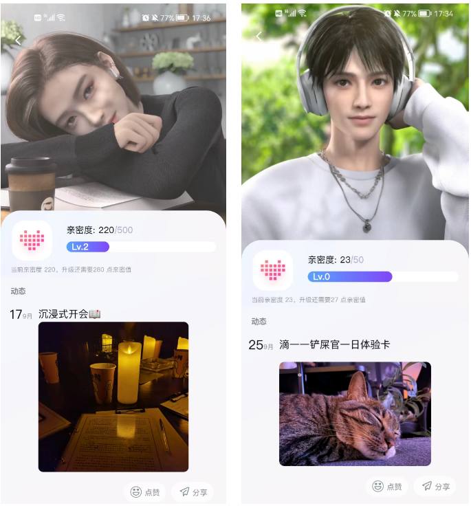 而主攻国内市场的“小冰虚拟恋人”用户量更大——截至2022年上半年,小冰的虚拟陪伴(包括虚拟男友/女友/陪护等)拥有了数千万高活用户,约16%的用户每周平均和虚拟陪伴能聊3800轮。