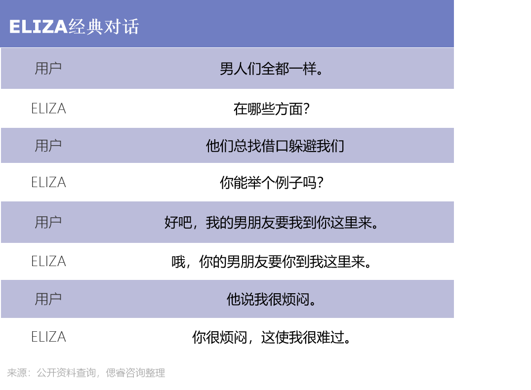 16年过去,第一个聊天机器人程序ELIZA诞生,用于临床模拟心理治疗领域。开发者科尔比意识到,很多病人重复地向心理医生咨询相似的问题,一个不厌其烦的机器人能够帮医生省不少事。