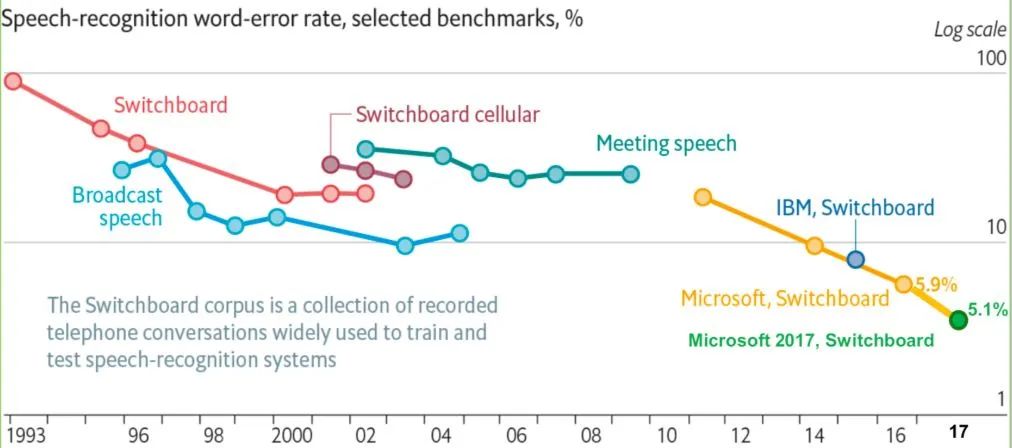 该技术从1988年发展,最开始只能识别一些慢速的、特殊的实验室数据,一直到2009年开始火速发展——错误率直线下降。
