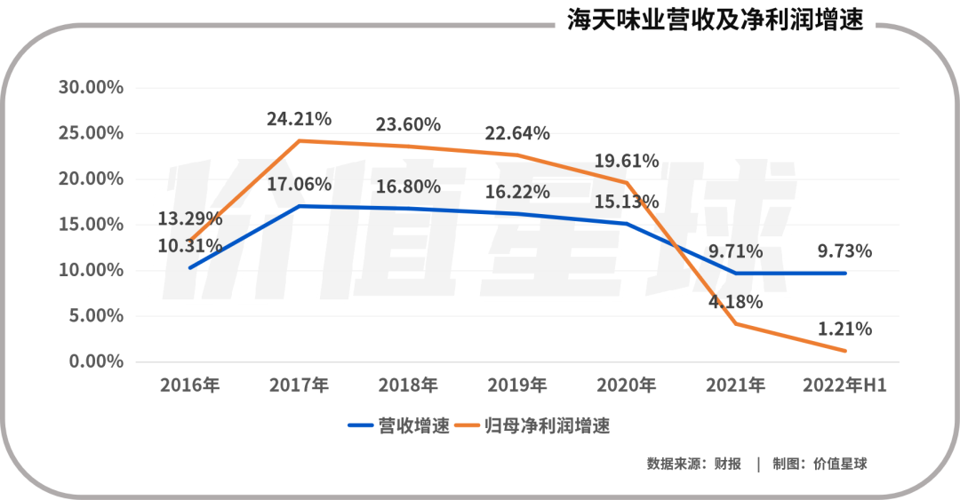 然而2021年,海天味业营收同比仅增长了9.71%,归母净利润同比增速同样只有4.18%,是上市以来的最低值。到了2022年,这种颓势并没有得到实质性扭转,上半年公司营收增速9.73%,归母净利润增速1.21%。