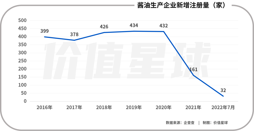 企查查数据显示,截止到2022年7月,我国酱油制造企业共5276家存续或在业,3年内(2019年7月-2022年7月)有852家相关企业成立,有134家企业注销或者登记状态异常,每年净增长239家企业。而随着2021年行业遇冷,新增注册企业数量骤减至161家,2022年上半年仅注册32家。