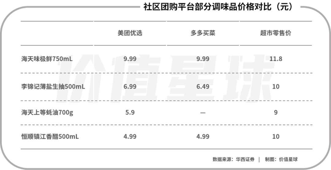 可比口径下,社区团购中酱油的单价也明显低于商超渠道。举例来看,海天味极鲜750mL的超市零售价为11.8元,但是在美团优选和多多买菜上只要花9.99元就能买到,差价近2元。而李锦记薄盐生抽500mL的超市零售价一般为10元,在美团优选和多多买菜上的价格均不到7元。