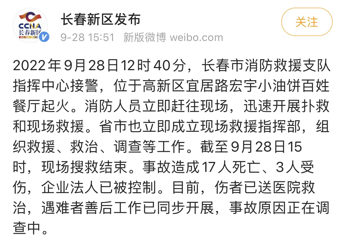 据@长春新区发布 微博消息,2022年9月28日12时40分,长春市消防救援支队指挥中心接警,位于高新区宜居路宏宇小油饼百姓餐厅起火。消防人员立即赶往现场,迅速开展扑救和现场救援。省市也立即成立现场救援指挥部,组织救援、救治、调查等工作。截至9月28日15时,现场搜救结束。事故造成17人死亡、3人受伤,企业法人已被控制。目前,伤者已送医院救治,遇难者善后工作已同步开展,事故原因正在调查中。