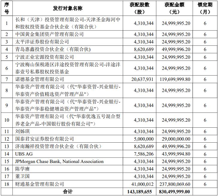 创业环保9月28日公布非公开发行A股股票发行情况报告书,此次发行价格为5.80元/股,发行股数约1.43亿股,募集资金总额约8.30亿元。此次发行对象最终确定为18家。其中诺德基金获配2063.79万股,获配金额1.20亿元;财通基金认购2.38亿元,华泰资管、UBS AG及JPMorgan等参投。