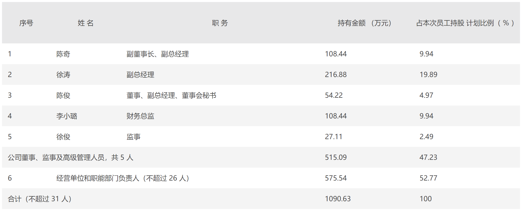 具体来看,参与本期员工持股计划人员中,公司副总经理徐涛拟购买股份数量最多,为8万股,拟出资金额216.88万元。以最新收盘价计算,若徐涛顶格认购本次员工持股计划股票,入手浮盈将近168万元。据了解,徐涛于2022年3月被聘任为公司副总经理,此前曾任公司销售事业部总经理、首席增长官等职。