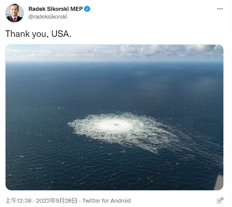 而就在乌克兰表态当天,波兰前外长、前防长、欧洲议会现任议员西科尔斯基(Radek Sikorski)在Twitter发文暗指美国发动了对北溪管道的袭击。他在推文中放出管道泄漏的照片并配文:“谢谢你,美国。”