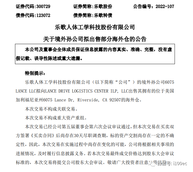 日前,乐歌股份发布公告称,公司境外孙公司6075 LANCE LLC拟出售位于加利福尼亚州6075 Lance Dr, Riverside, CA 92507的海外仓。上述标的涉及的建筑面积361,346平方英尺,资产原值4438.5美金,截止2022年9月已计提折旧146.37万美金,净值为4292.13万美金。