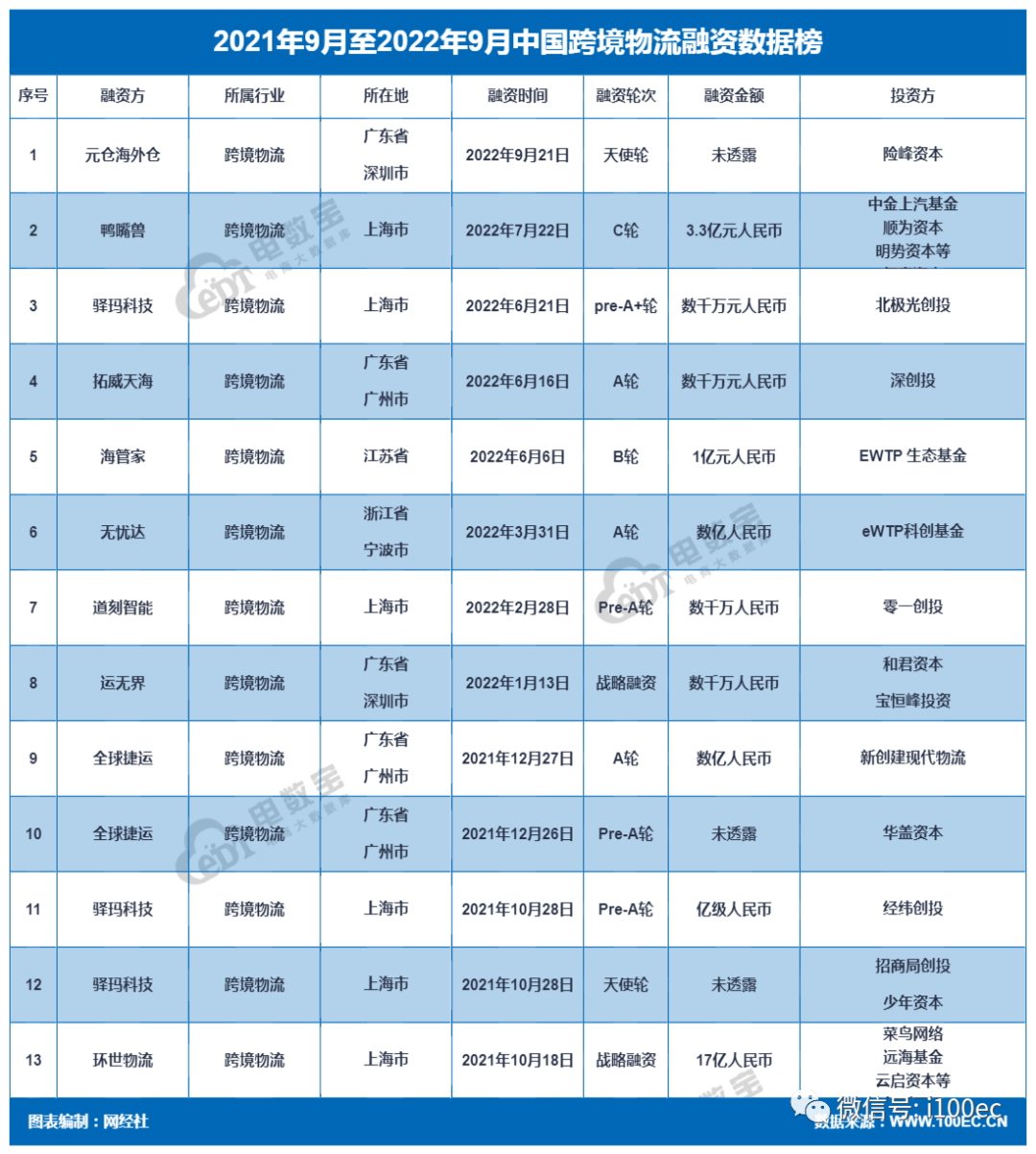 在资本方面,据网经社“电数宝”(DATA.100EC.CN)电商大数据库显示,2021年9月至2022年9月,国内跨境物流领域共发生了13起投融资事件,融资总额超27.1亿元。涉及的公司包括:元仓海外仓、鸭嘴兽、驿玛科技、拓威天海、海管家、无忧达、道刻智能、运无界、全球捷运、环世物流。