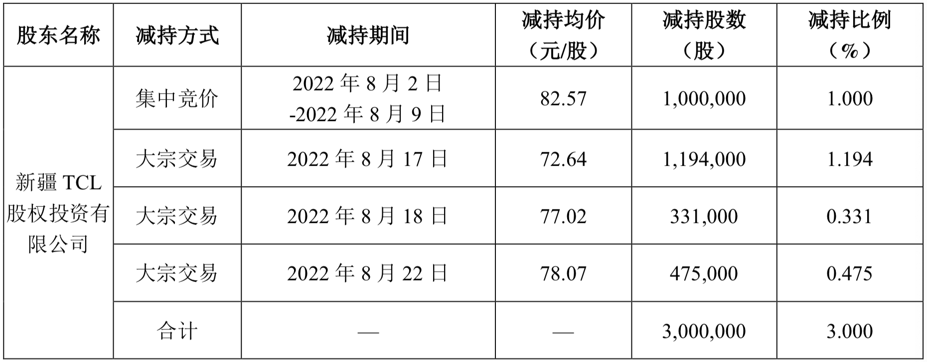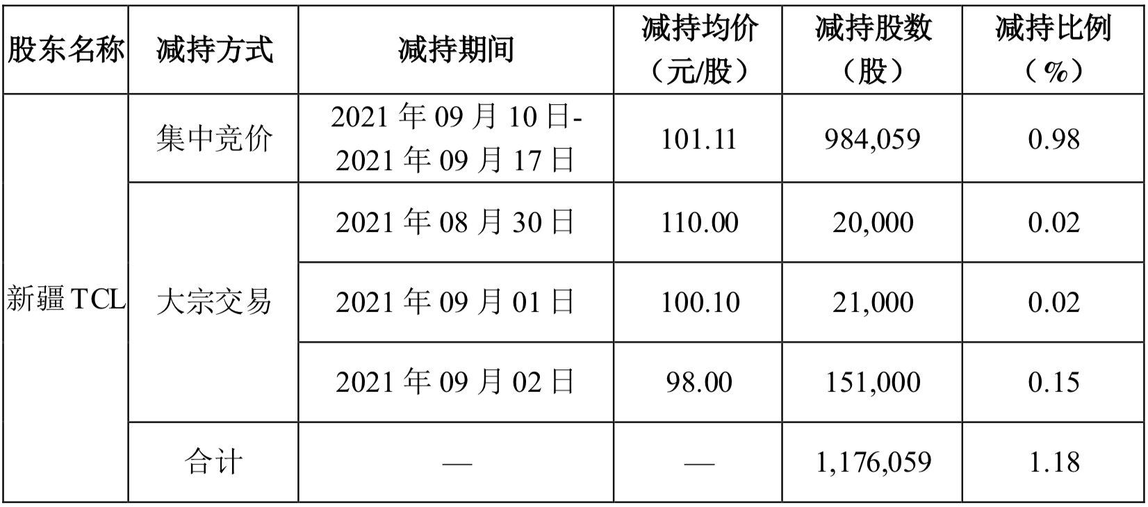 这280.51万股与今年6月新疆TCL的低价“变相”减持相对应。6月17日,新疆TCL通过协议转让方式将其持有的帝科股份280.51万股 (占总股本的2.8051%)转让给其一致行动人宁波TCL股权投资有限公司,转让价格为34.07元/股,转让总价款为9557.12万元。