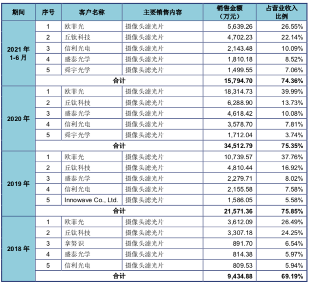 产品属性决定其主要客户为摄像头模组生产厂商,客户包括欧菲光(002456.SZ)、丘钛科技(01478.HK)、舜宇光学(02382.HK)、同兴达(002845.SZ)四家上市公司。