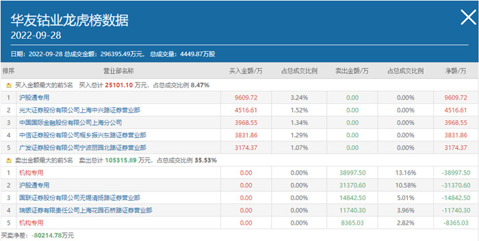 值得注意的是,买入前五席位中,沪股通专用席位位居第一位,当日买入金额为9609.72万元,此外,光大证券股份有限公司上海中兴路证券营业部、中国国际金融股份有限公司上海分公司、中信证券股份有限公司桐乡振兴东路证券营业部和广发证券股份有限公司宁波丽园北路证券营业部,分别位居买2、买3、买4和买5席位,当日买入金额分别为4516.61万元、3968.55万元、3831.86万元和3174.37万元。买卖前五席位的买卖净差为-80214.78万元。