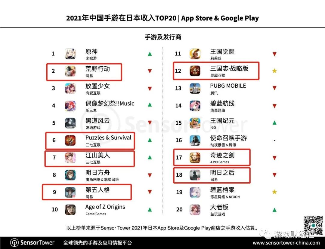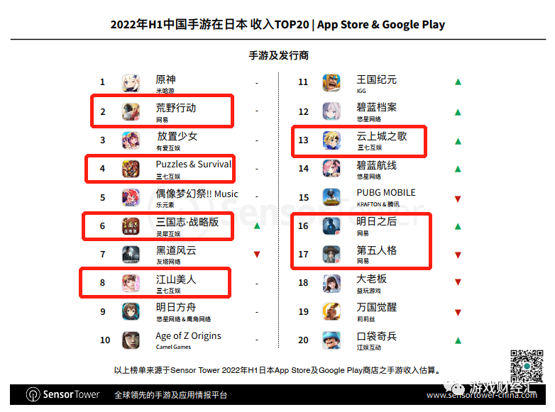 值得关注的是,《三国志·战略版》、《Puzzles &Survival》、《云上城之歌》3款产品同时进入中国手游日本及韩国收入榜TOP20。