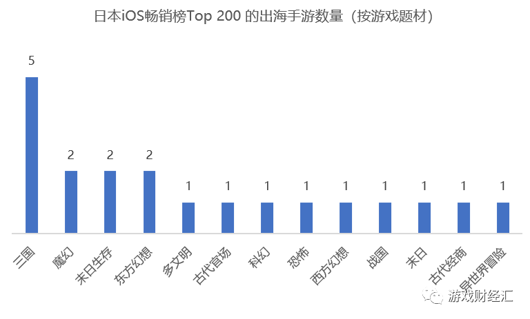 2、从游戏题材来看,广州游戏公司出海日本表现最好的品类是三国题材,其次是末日生存、魔幻以及东方幻想题材。