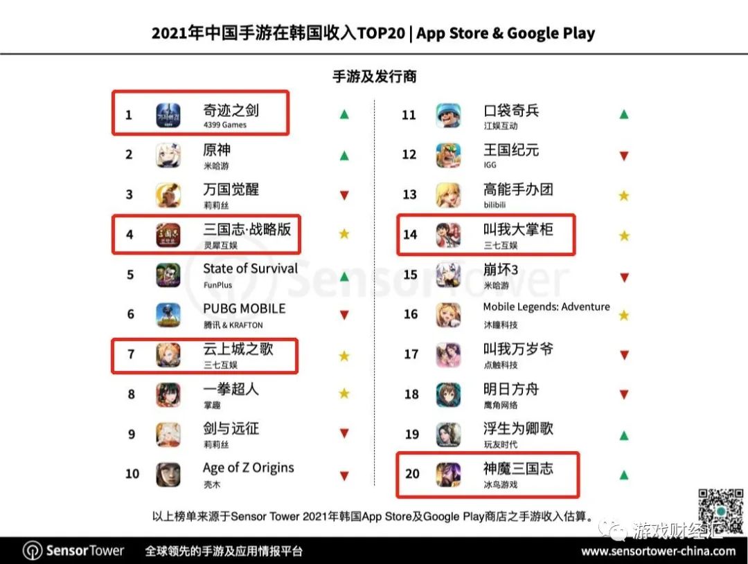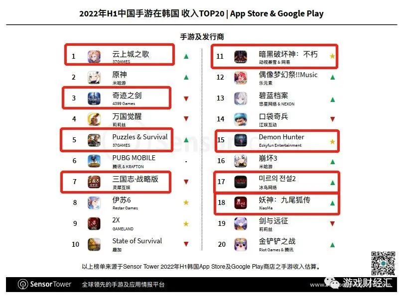 根据Sensor Tower数据显示,22年上半年,三七、4399、灵犀互娱、网易、天游(Eskyfun)、冰鸟网络、小马游戏7家公司旗下8款产品入围中国手游韩国收入榜TOP20。