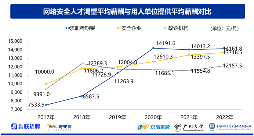 2019年起网络安全行业求职者的平均薪资要求就开始高于企业给的实际平均工资水平。2022年求职者期望的平均薪酬约为14161.8元/月,同比增148.6元/月,而政企机构提供的网络安全相关岗位的平均薪酬约为12157.5元/月,安全企业提供给网络安全相关岗位的平均薪酬约为13718.5元/月。