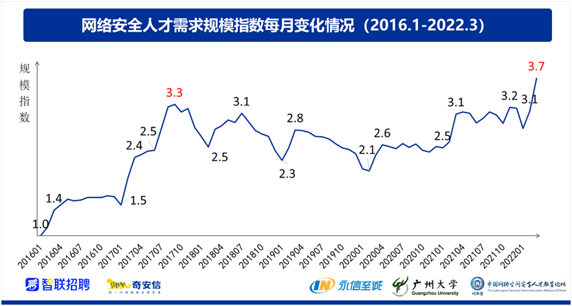 根据智联招聘的数据,网络安全人才需求规模指数几次达到高峰的时间段均与国家有关部门发布重要安全管理规范法律的时间点相对应。