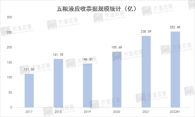 数据显示,近年来五粮液应收票据规模居高不下,且仍呈现大幅增长状态。今年上半年高达252.48亿,同比增长38.46%,占营收比重已超过60%。而茅台该项仅为1.44亿,泸州老窖为16.73亿。